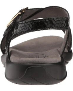 - Embossed leather uppers with an open toe.