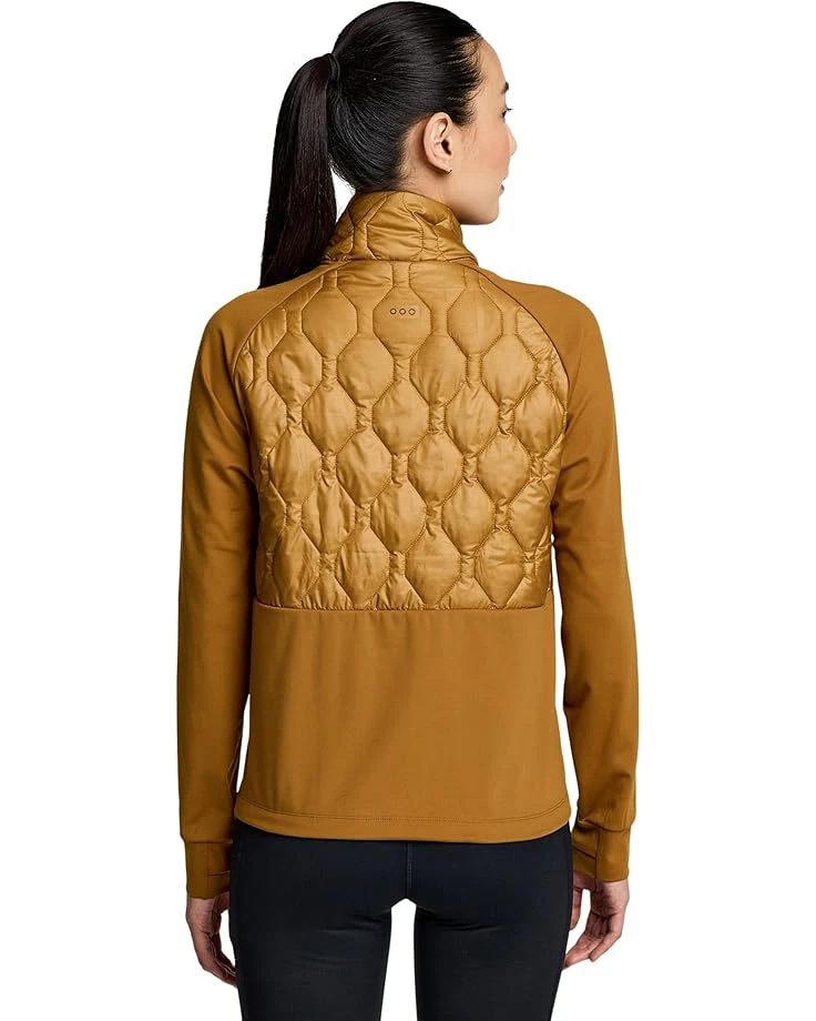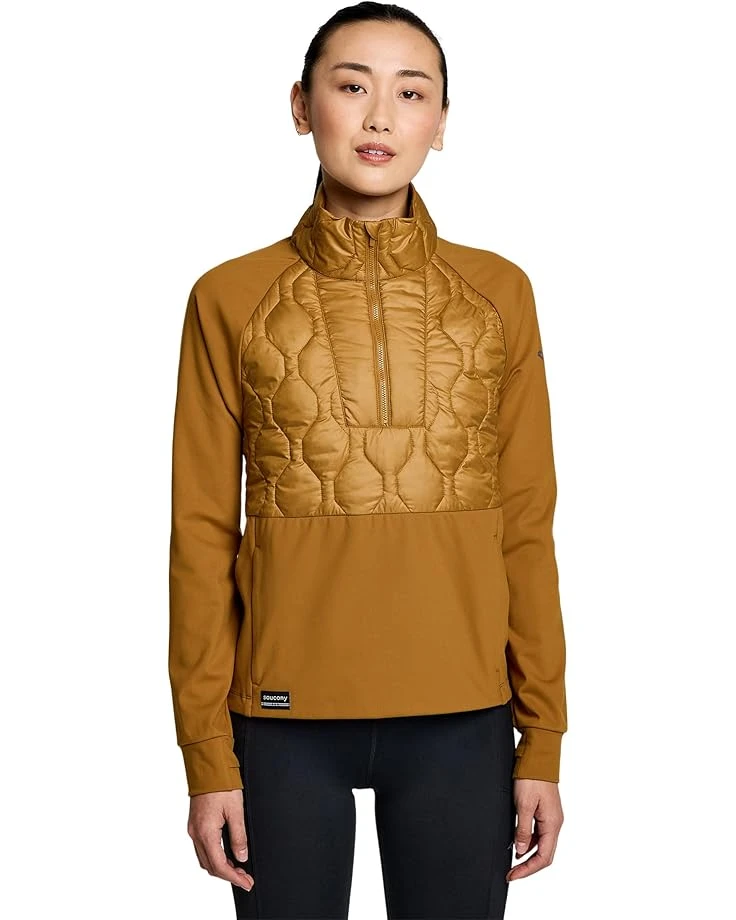 - Engineered for performance, comfort, and style, the Saucony® Solstice Oysterpuff 1/2 Zip Activewear Shirt is destined to become your favorite choice this fall. It is framed with a wind-resistant and water-resistant shell to deliver weatherproof performance and infused with plush quilted fleece panels for breathability. Structured with a stand collar with a half zippered front placket, the top displays long sleeves with knit cuffs and thumbholes, offering extra coverage and sealing out cold.